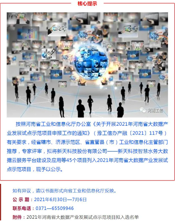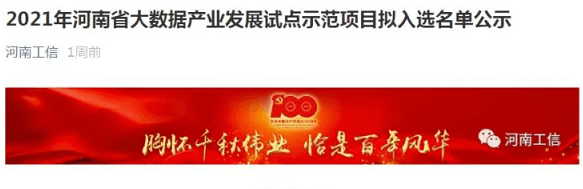 按照河南省工业和信息化厅办公室《关于开展2021年河南省大数据产业发展试点示范项目申报工作的通知》(豫工信办产融〔2021〕117号)有关要求,经省辖市、济源示范区、省直管县(市)工业和信息化主管部门推荐、专家评审,7月初,河南省工业和信息化厅产业融合办公室公布2021年河南省大数据产业发展试点示范项目名单。