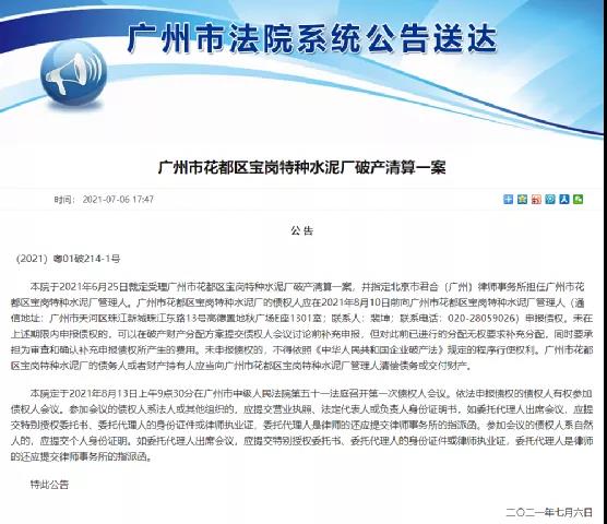 7月6日广州市法院发布公告称已于6月25日裁定受理广州市花都区宝岗特种水泥厂破产清算一案,并指定北京市君合(广州)律师事务所担任广州市花都区宝岗特种水泥厂管理人。债权人需在8月10日前向广州市花都区宝岗特种水泥厂管理人申报债权。