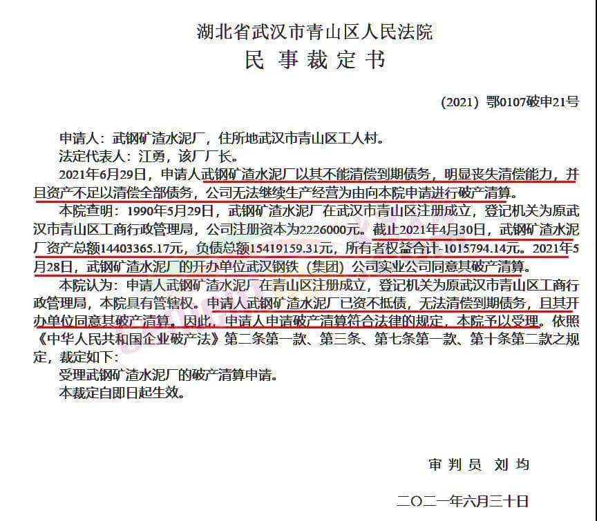 6月29日,申请人武钢矿渣水泥厂以其不能清偿到期债务,明显丧失清偿能力,并且资产不足以清偿全部债务,公司无法继续生产经营为由向法院申请进行破产清算。截止2021年4月30日,武钢矿渣水泥厂资产总额约1440万,负债总额约1542万元,所有者权益合计约-101.58万元。2021年5月28日,武钢矿渣水泥厂的开办单位武汉钢铁(集团)公司实业公司同意其破产清算。