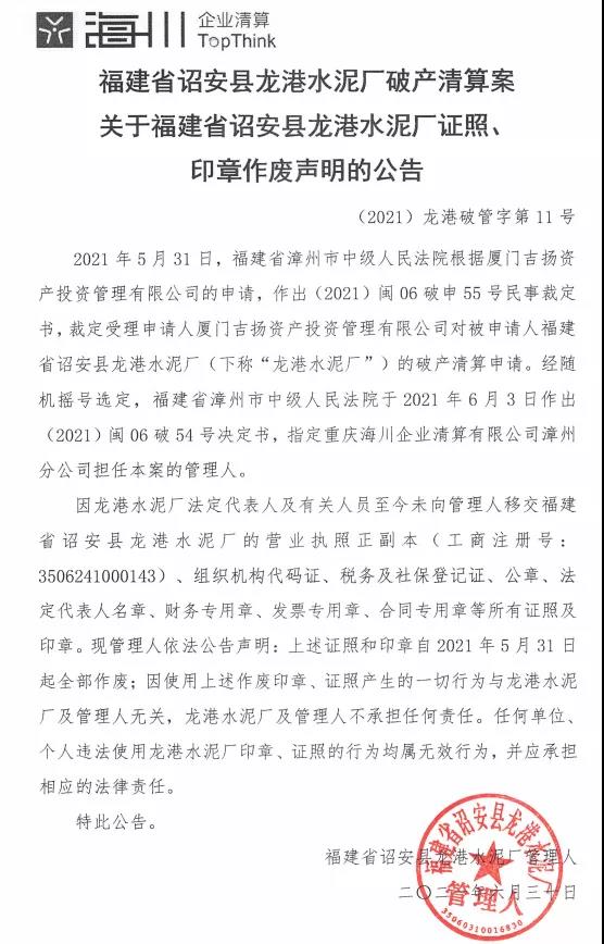 福建龙港水泥、江苏运通水泥破产清算,证照、印章作废