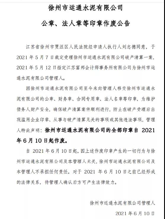 6月10日徐州市运通水泥有限公司管理人公告,江苏省徐州市贾汪区人民法院经申请人执行人刘志德同意,于5月7日裁定受理徐州市运通水泥有限公司破产清算一案,并于5月12日指定江苏富邦会计师事务所有限公司为徐州市运通水泥有限公司管理人。因徐州市运通水泥有限公司至今未向管理人移交徐州市运通水泥有限公司的相关证照和印章,管理人声明徐州市运通水泥有限公司的全部印章作废。