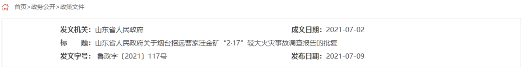 山东省政府同意事故调查组对事故的原因分析和责任认定。烟台招远曹家洼金矿“2·17”火灾事故是一起由于企业违规动火作业引发的较大生产安全责任事故,27人将被追责问责。