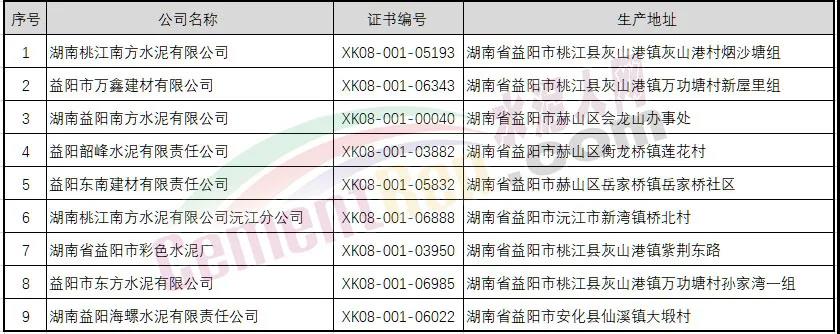 据市场监管总局工业品生产许可证办公室数据显示,位于湖南益阳市的水泥生产企业共有包括南方水泥、海螺水泥子公司在内的9家企业。