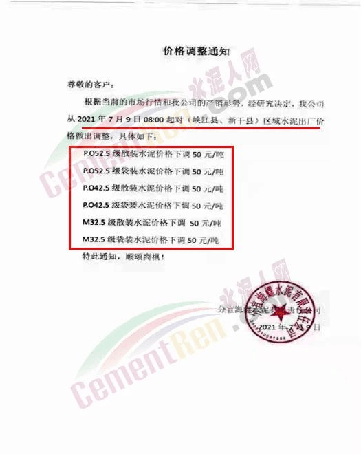 日前,分宜海螺水泥有限责任公司发价格调整通知称,根据当前的市场行情和公司的产销形势,决定从7月9日上午8时起对峡江县、新干县区域水泥出厂价格作出调整,各标号水泥价格下调50元/吨。