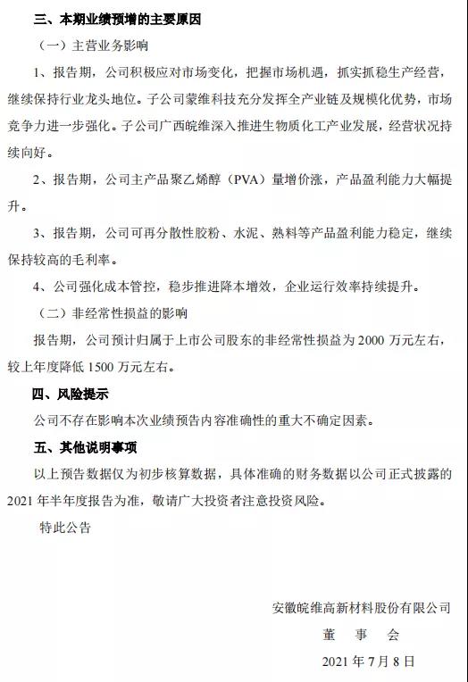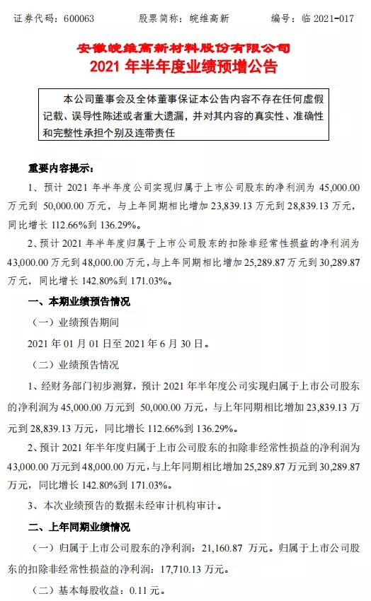 7月7日,皖维高新(600063)发布2021年半年度业绩预告:预计2021年半年度公司实现归属于上市公司股东的净利润为4.5亿元到5亿元,与上年同期相比增加2.3亿元到2.8亿元,同比增长112.66%到136.29%。