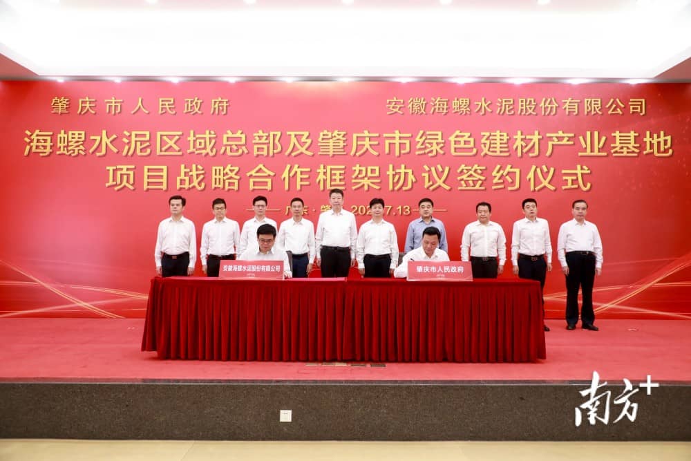 7月13日,肇庆市与安徽海螺水泥股份有限公司签订海螺水泥区域总部及肇庆市绿色建材产业基地项目战略合作框架协议,双方将在绿色建材产业等领域开展全面深化合作,共同打造国内一流的新型建材领域科技创新和产业发展平台。