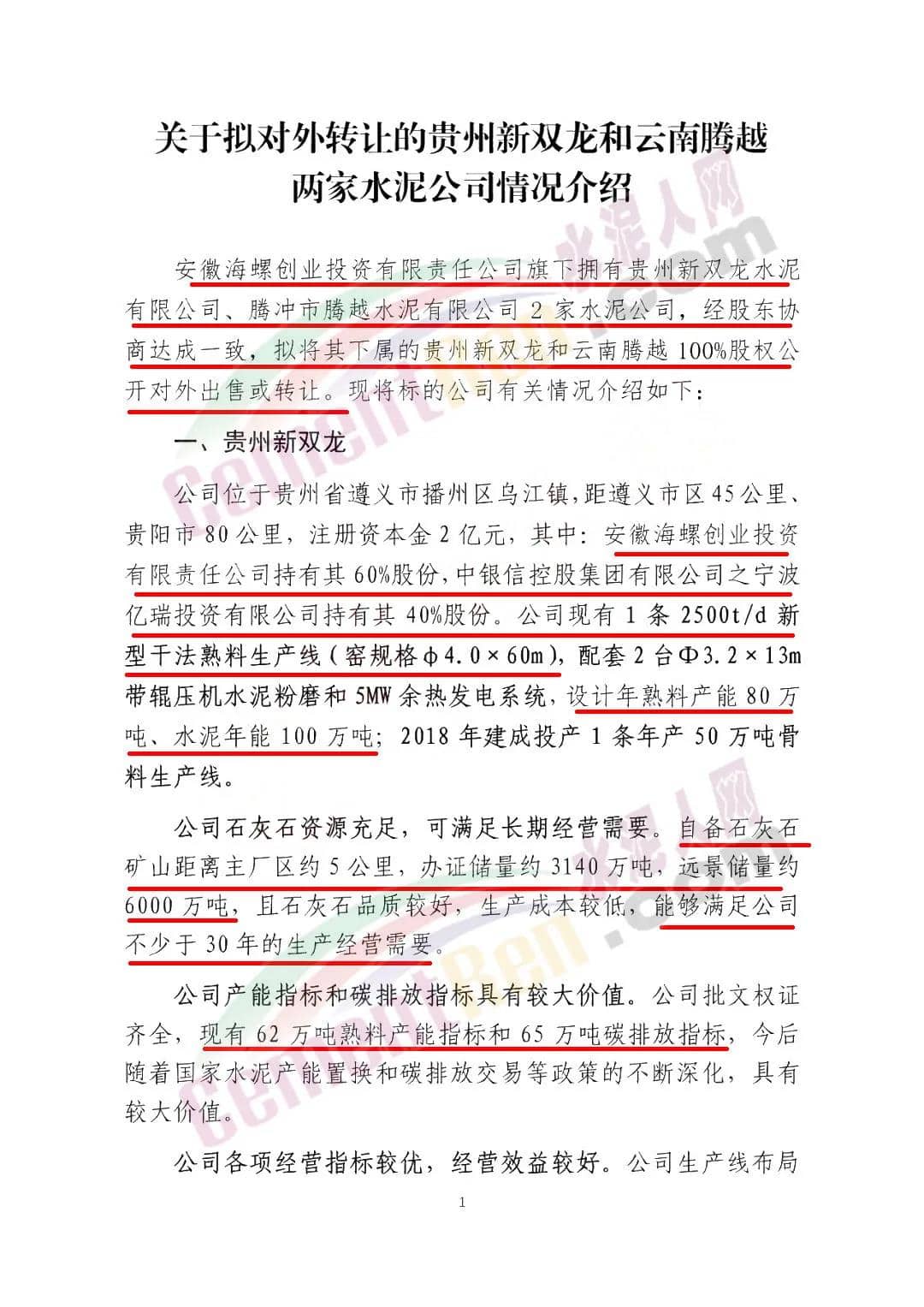 日前,安徽海螺创业投资有限责任公司发布《关于拟对外转让的贵州新双龙和云南腾越两家水泥公司情况介绍》拟将其下属的贵州新双龙和云南腾越100%股权公开对外出售或转让。