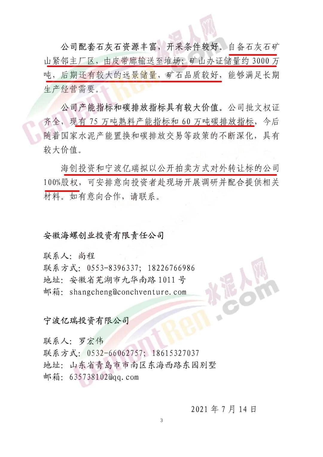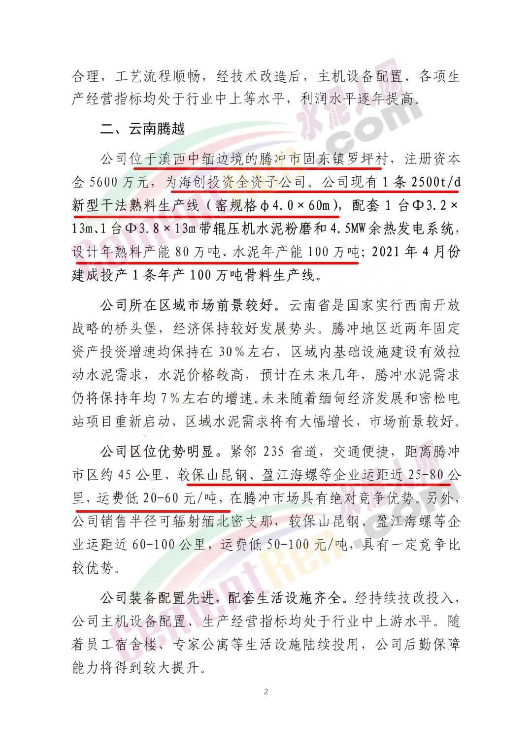 《情况介绍》提到安徽海螺创业投资有限责任公司旗下拥有贵州新双龙水泥有限公司、腾冲市腾越水泥有限公司2家水泥公司,经股东协商达成一致,拟将其下属的贵州新双龙和云南腾越100%股权公开对外出售或转让。