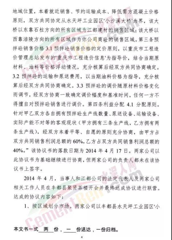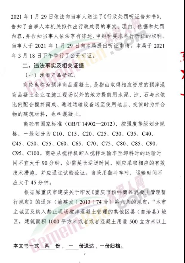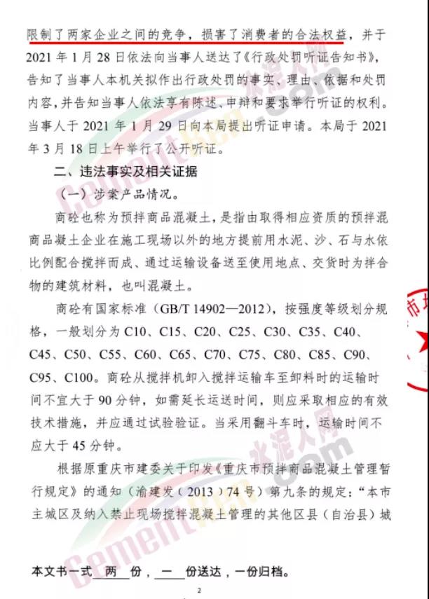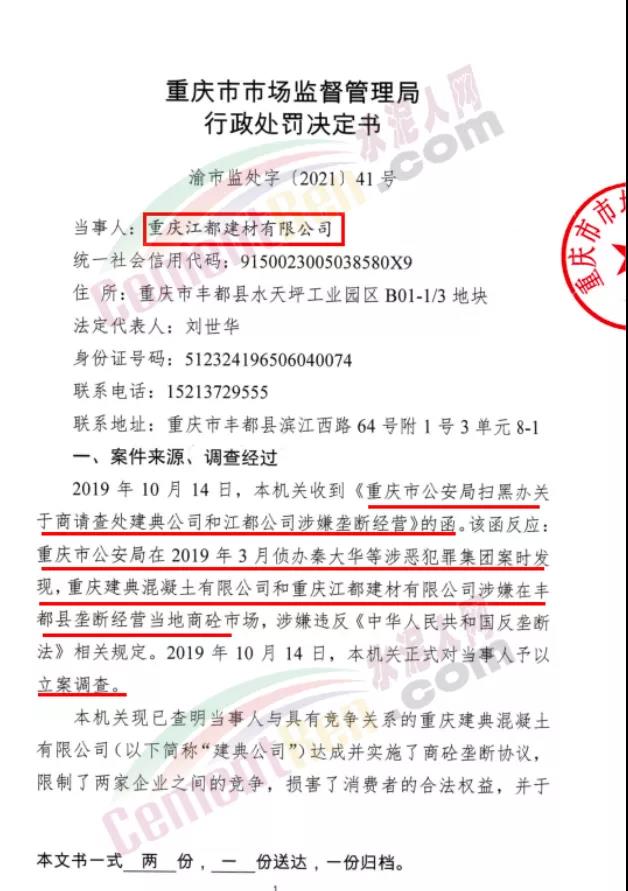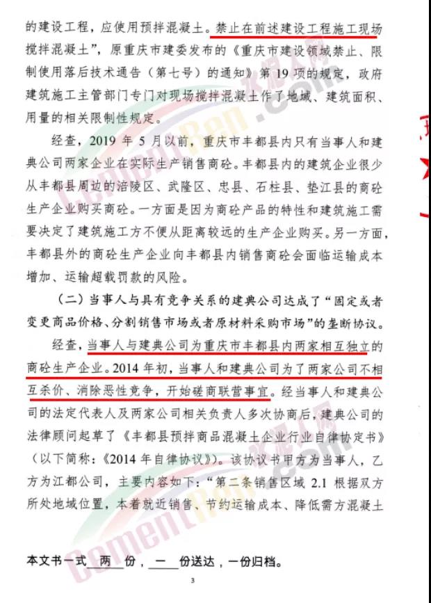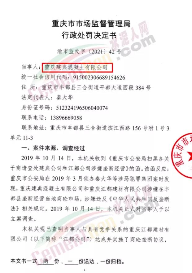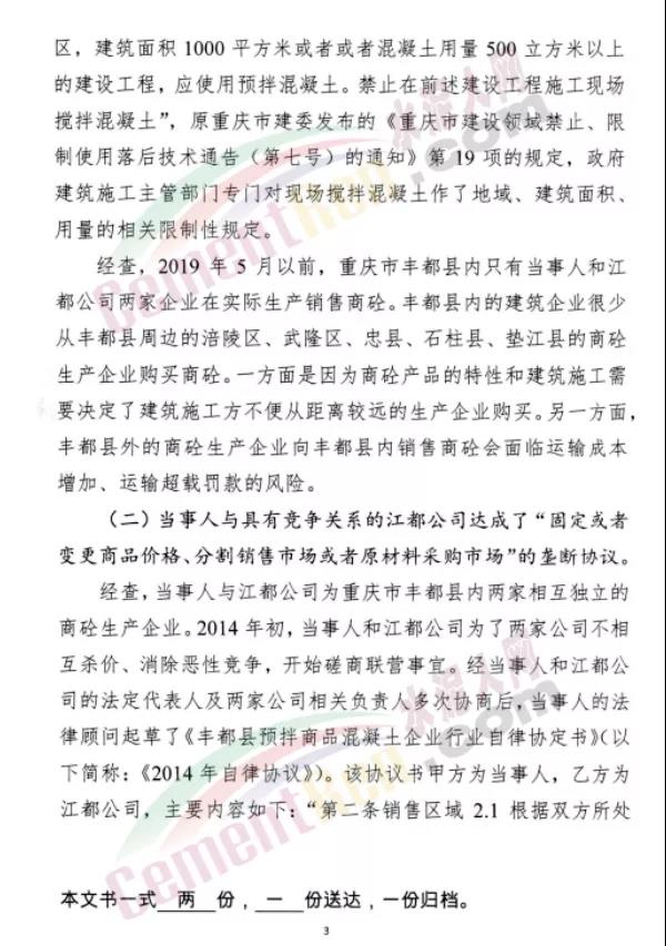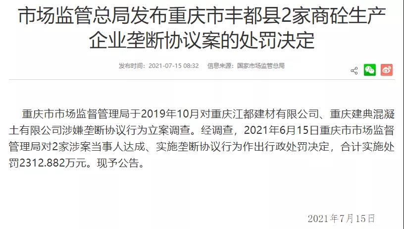 7月15日市场监管总局发布重庆市丰都县2家商砼生产企业垄断协议案的处罚决定称,重庆市市场监督管理局于2019年10月对重庆江都建材有限公司、重庆建典混凝土有限公司涉嫌垄断协议行为立案调查。经调查,2021年6月15日重庆市市场监督管理局对2家涉案当事人达成、实施垄断协议行为作出行政处罚决定,合计实施处罚2312.882万元。