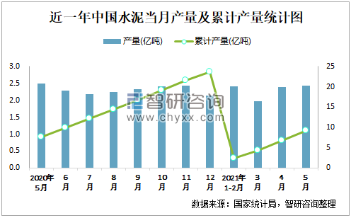 根据国家统计局数据显示:2021年5月中国水泥产量为2.4亿吨,同比下降3.2%;2021年1-5月中国水泥累计产量为9.2亿吨,累计增长19.2%;2015-2020年中国水泥产量2018年跌至最低,此后呈现上升趋势。