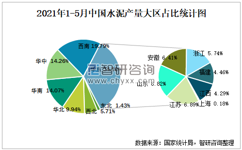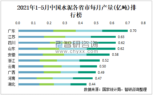 根据国家统计局数据显示:2021年各季度(第二季度目前暂只统计4月和5月数据)中国水泥主要集中在华东、西南、华中地区生产;2021年1-5月中国水泥产量大区分布不均衡,其中华东地区产量最高,特别是江苏、山东、安徽贡献的产量占比较多;2021年1-5月中国水泥各省市产量呈现梯队式分布,广东、江苏、四川等省产量最多。