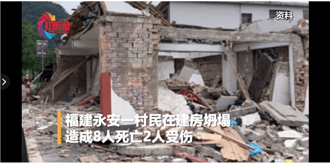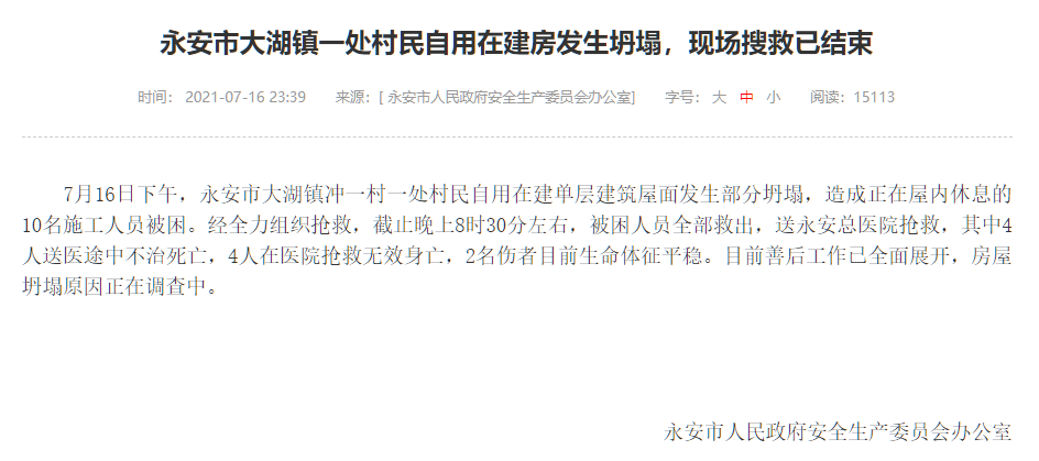7月16日下午,福建三明永安市大湖镇冲一村一处村民自用在建单层建筑屋面发生部分坍塌,造成正在屋内休息的10名施工人员被困。经全力组织抢救,截止晚上8时30分左右,被困人员全部救出,送永安总医院抢救,其中4人送医途中不治死亡,4人在医院抢救无效身亡,2名伤者目前生命体征平稳。目前善后工作已全面展开,房屋坍塌原因正在调查中。