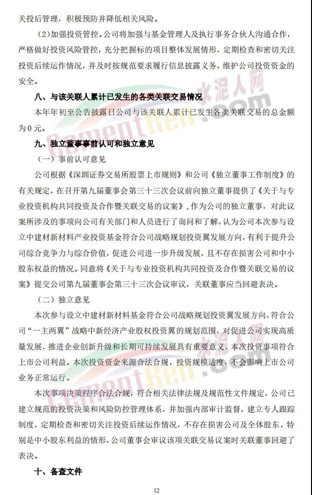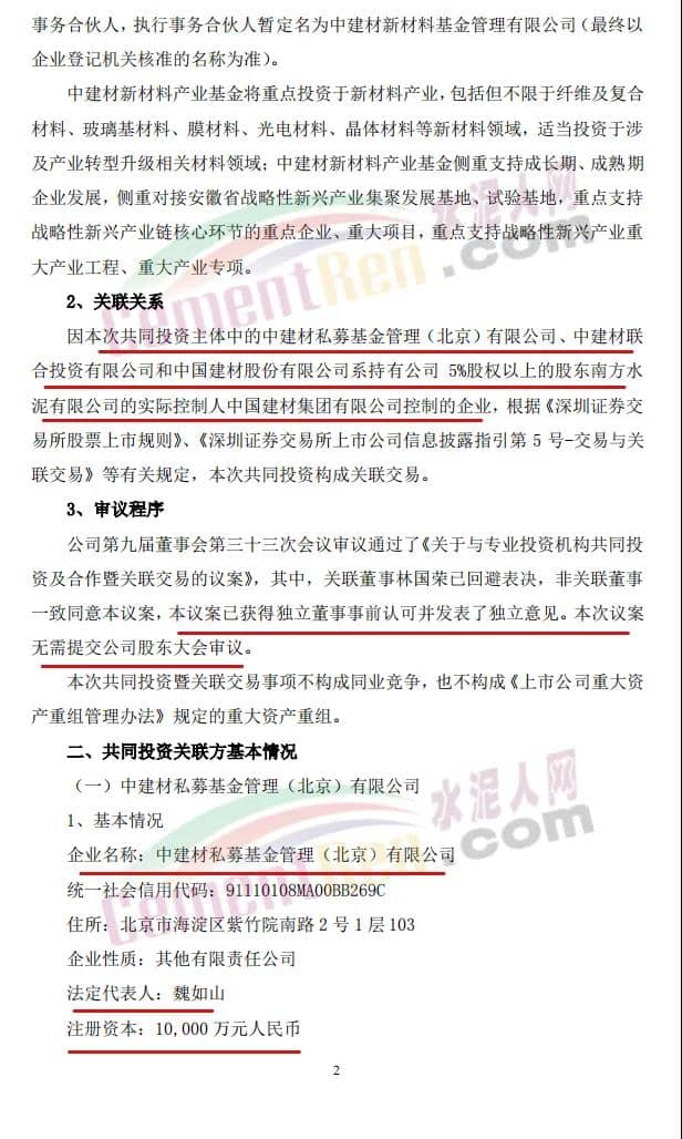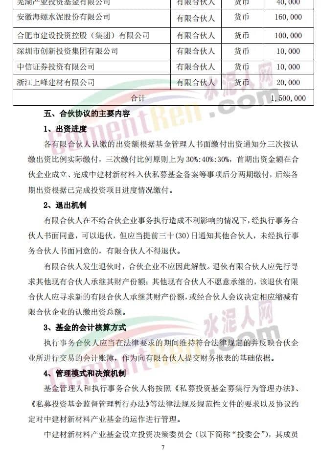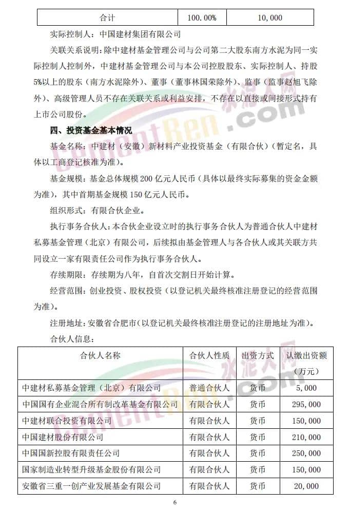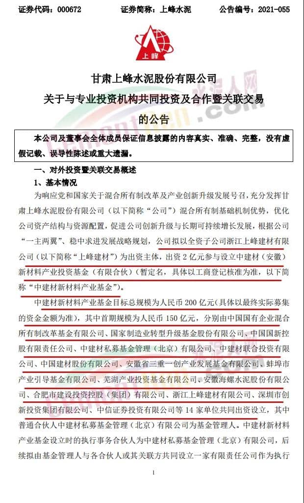 16日,上峰水泥发布《关于与专业投资机构共同投资及合作暨关联交易的公告》称,公司拟以全资子公司浙江上峰建材有限公司(以下简称“上峰建材”)为出资主体,出资2亿元参与设立中建材(安徽)新材料产业投资基金(有限合伙)(暂定名,具体以工商登记核准为准,以下简称“中建材新材料产业基金”)。
