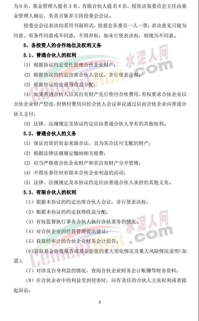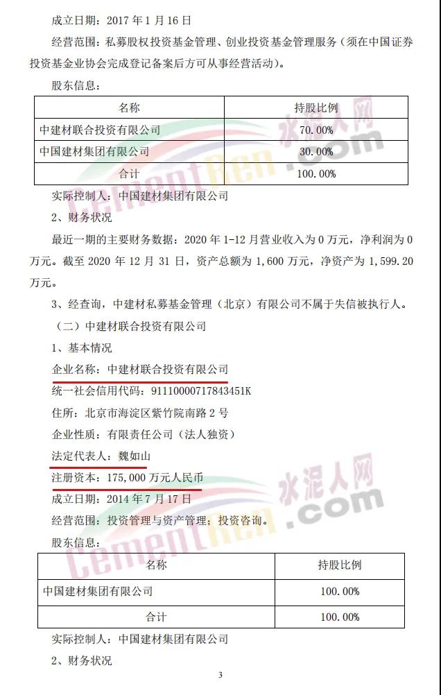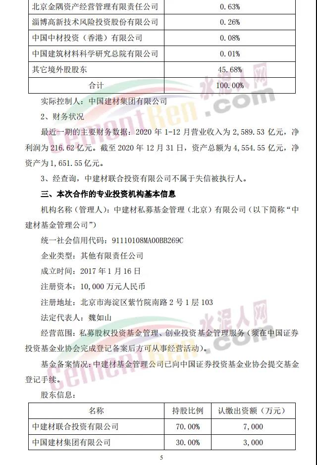 中建材新材料产业基金目标总规模为人民币200亿元(具体以最终实际募集的资金金额为准),其中首期规模为人民币150亿元,由14家单位共同出资设立,普通合伙人中建材私募基金管理(北京)有限公司为基金管理人,基金将重点投资于新材料产业,包括但不限于纤维及复合材料、玻璃基材料、膜材料、光电材料、晶体材料等新材料领域。