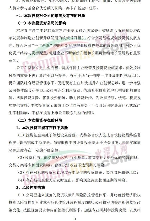 独特的混合所有制机制形成的“高效+规范”文化已成为公司持续健康发展的根本基础和核心优势之一。本次响应中国建材及国有大型政策引导基金的发起而积极参与设立新材料产业基金,是公司继续贯彻与传承总体发展战略的务实行动,对进一步优化资产结构与资源配置,促进企业不断创新升级和长期可持续增长发展具有重要意义。