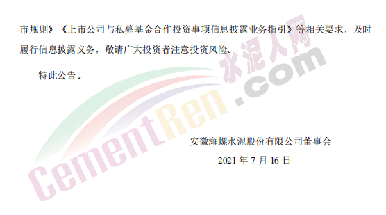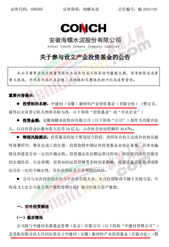 当日晚间,海螺水泥(600585.SH)发布公告称,公司拟与中建材私募基金管理(北京)有限公司(简称“中建材管理公司”)及其他有限合伙人共同出资设立中建材(安徽)新材料产业投资基金(有限合伙)(暂定名,最终以企业登记机关核准名称为准)。