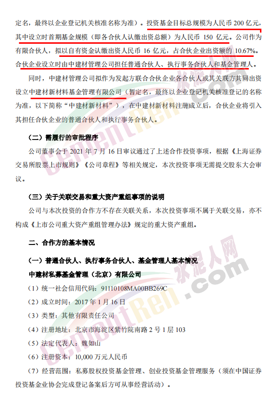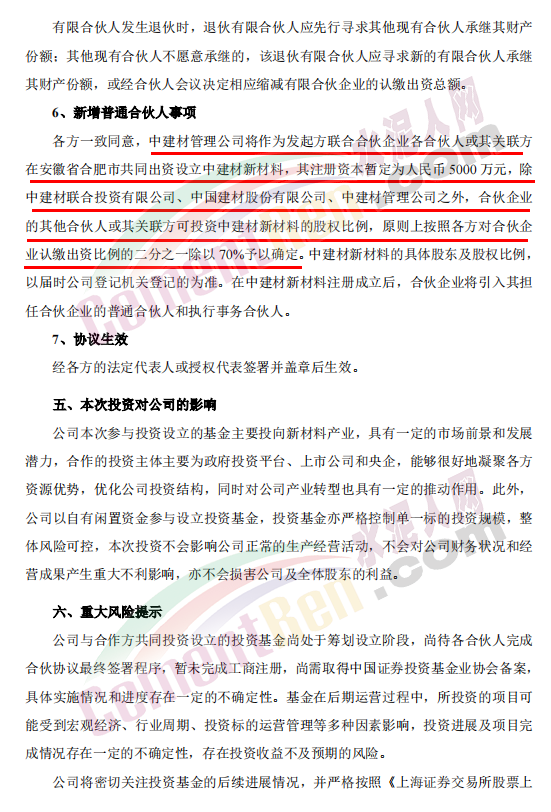同时,中建材管理公司拟作为发起方联合合伙企业各合伙人或其关联方共同出资设立中建材新材料基金管理有限公司(暂定名,最终以企业登记机关核准登记的名称为准,简称“中建材新材料”),在中建材新材料注册成立后,合伙企业将引入其担任合伙企业的普通合伙人和执行事务合伙人。