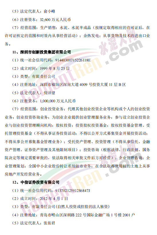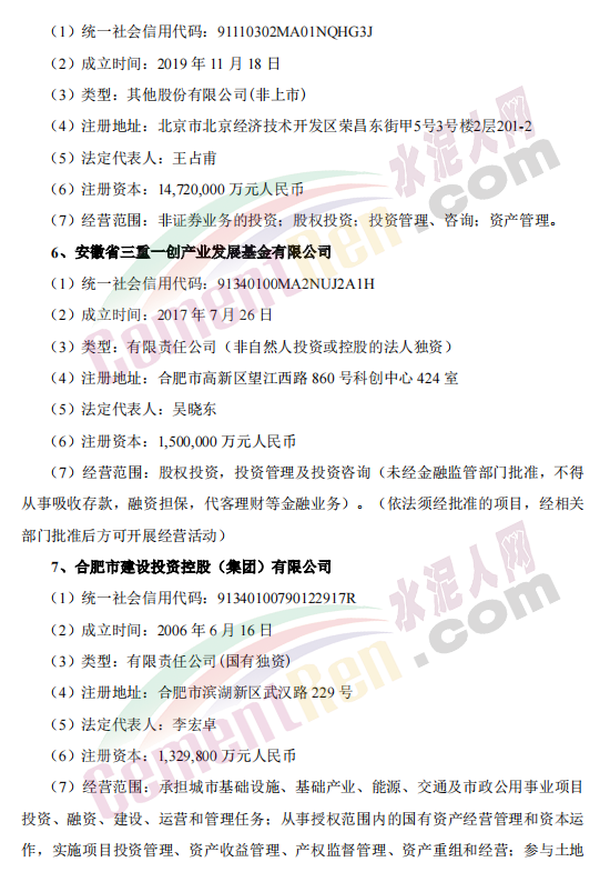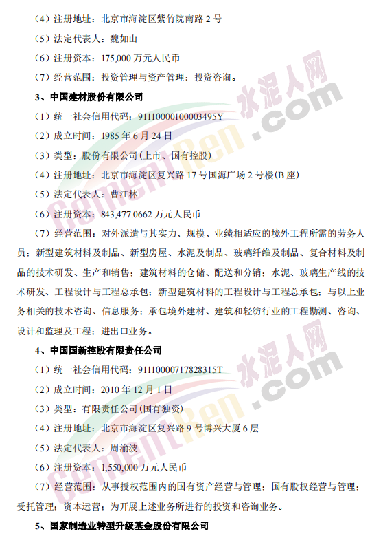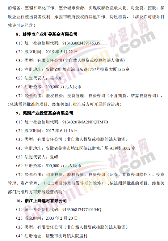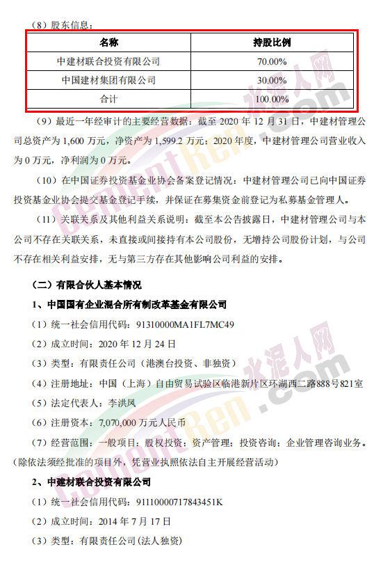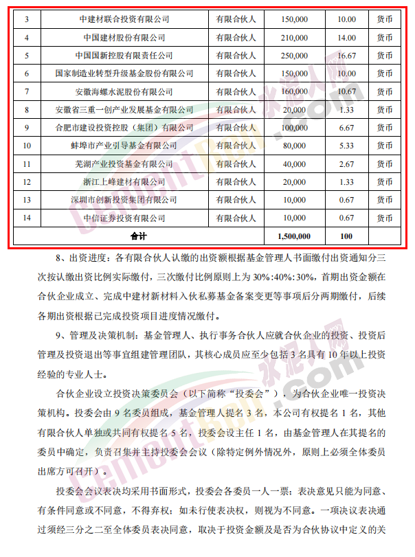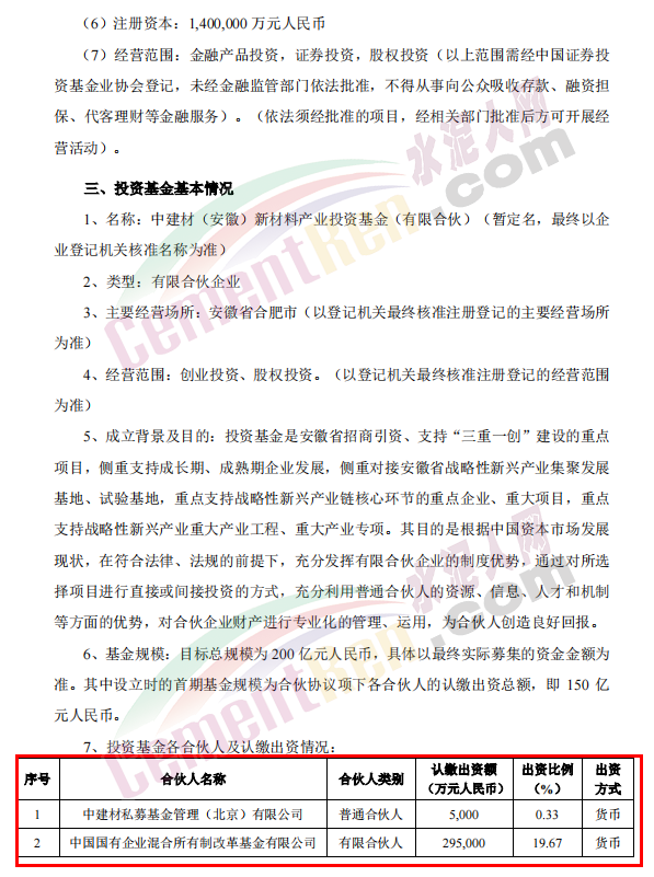 中建材新材料产业基金分别由中国国有企业混合所有制改革基金、国家制造业转型升级基金股份、国新控股、中建材私募基金管理(北京)有限公司、中建材联合投资有限公司、中国建材、安徽省三重一创产业发展基金、蚌埠市产业引导基金、芜湖产业投资基金、海螺水泥、合肥建投、上峰建材、深创投、中信证券投资等14家单位共同出资设立,其中普通合伙人中建材私募基金管理(北京)有限公司为基金管理人。