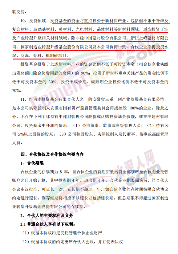 投资领域:投资基金的资金将重点投资于新材料产业,包括但不限于纤维及复合材料、玻璃基材料、膜材料、光电材料、晶体材料等新材料领域,适当投资于涉及产业转型升级相关材料领域。除非经中国建材股份有限公司、浙江上峰建材有限公司、国家制造业转型升级基金股份有限公司及本公司协商一致,合伙企业不得投资水泥、商混、骨料、机制砂项目。