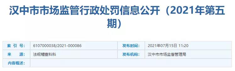 做出处罚的机关名称和日期:汉中市市场监督管理局2021年6月22日