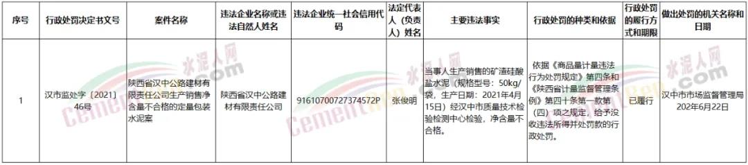7月15日,陕西汉中市市场监管局网站发布行政处罚信息公开表,涉及陕西省汉中公路建材有限责任公司生产销售净含量不合格的定量包装水泥案。