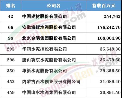 今年上榜公司的年营收门槛接近174亿元。受到新冠疫情影响,今年的上榜公司年收入门槛相比去年近178亿元的门槛降低了2.3%。去年中国GDP突破100万亿元,今年榜上500家上市公司的收入总和达53万亿元,超过了中国当年GDP的一半。其中中国建材股份有限公司、安徽海螺水泥股份有限公司、北京金隅集团股份有限公司、华润水泥控股有限公司、唐山冀东水泥股份有限公司、华新水泥股份有限公司、内蒙古西水创业股份有限公司、中国山水水泥集团有限公司等8家水泥行业上市企业上榜。