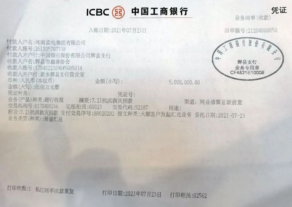 孟电集团捐款500万元支援新乡市防汛救灾:7月23日,全国道德模范、中国好人、辉县市孟庄镇南李庄村党支部书记、河南孟电集团党委书记范海涛同志代表集团第一时间向辉县市慈善协会捐款500万元,用于防汛抢险救灾。
