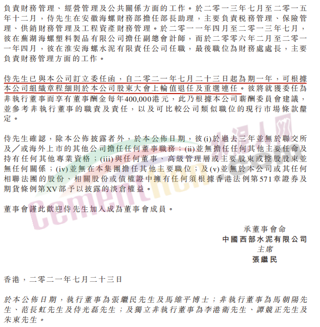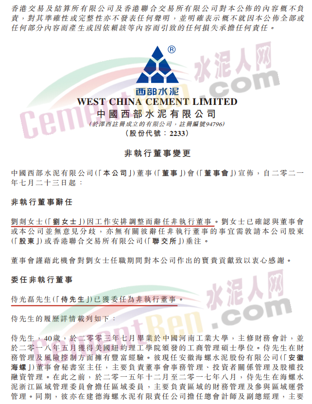 7月23日,西部水泥(02233)发布《非执行董事变更公告》,《公告》称,自2021年7月23日起:刘剡因工作安排调整而辞任非执行董事。侍光磊已获委任为非执行董事。具体公告如下:
