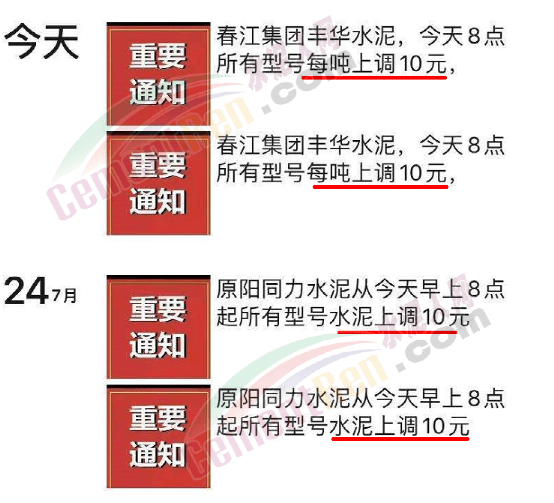 水泥人网通讯员消息,自24日原阳同力通知上调所有型号水泥价格10元/吨后,昨日(26日)春江集团丰华水泥也通知所有型号水泥上调10元/吨。