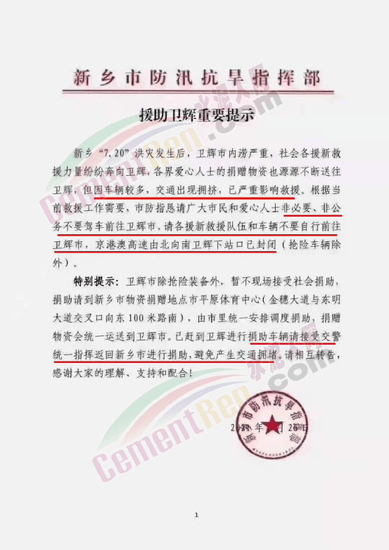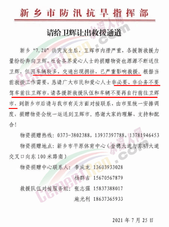 新乡市防汛抗旱指挥部发出的《请给卫辉让出救援通道》中提到新乡"7.20"洪灾发生后,卫辉市内涝严重,各援新救援力量纷纷奔向卫辉,社会各界爱心人士的捐赠物资也源源不断送往卫辉,但因车辆较多,交通出现拥挤,已严重影响救援。根据当前救援工作需要,恳请广大市民和爱心人士非必要、非公务不要驾车前往卫辉市,请各援新救援队伍和车辆不要再自行前往卫辉市,到新乡市后请与有关方面对接联系,由市里统一安排调度,捐赠物资会统一运送到卫辉市。