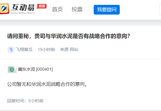 日前,有投资者在深市互动易向冀东水泥董秘提问,冀东水泥与华润水泥是否有战略合作意向?冀东水泥上市公司回复称,公司暂时无和华润水泥战略合作的意向。