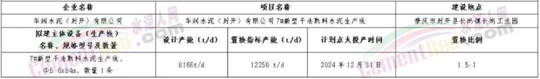 《冀东水泥铜川有限公司结余指标产能置换方案》显示,华润水泥(封开)有限公司将在广东省肇庆市封开县长岗镇长岗工业园内建设一条8166t/d新型干法熟料水泥生产线(7#线)。拟建主体为φ5.6m×84m新型干法水泥窑一条,置换指标产能合计12550t/d,置换比例1.5:1。计划点火投产时间,2024年12月31日。