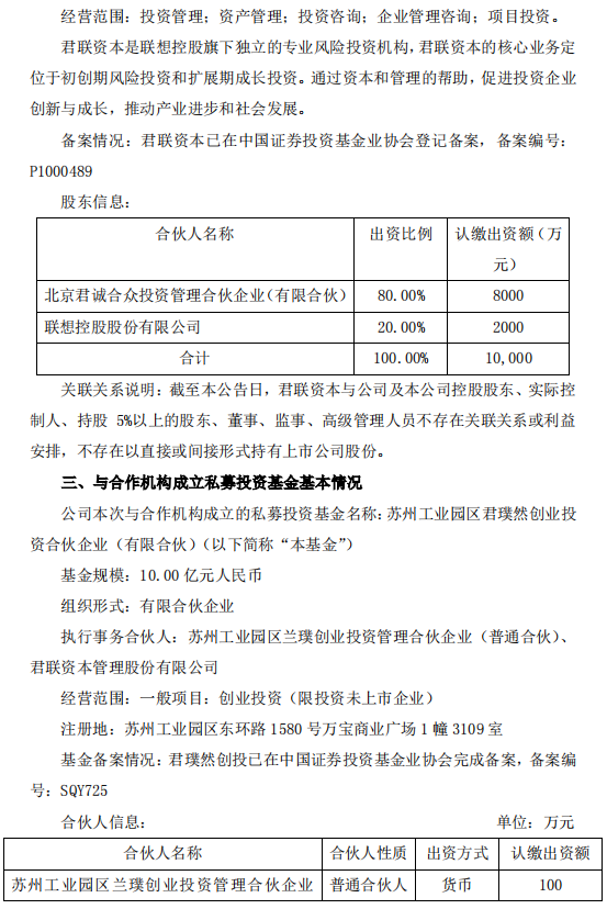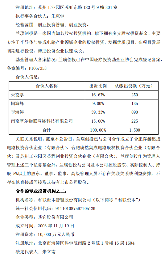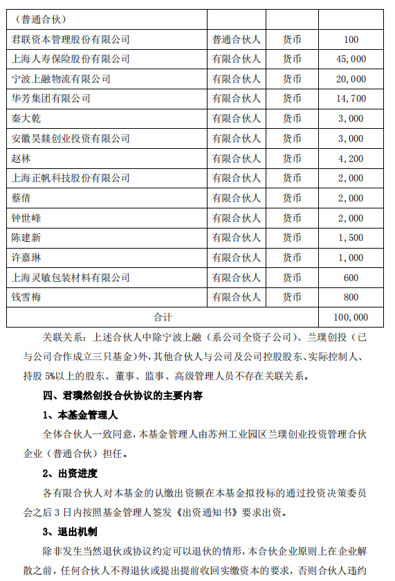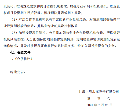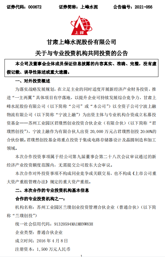 上峰水泥(000672)7月26日晚间公告,公司拟以全资子公司宁波上融物流有限公司(简称“宁波上融”)为出资主体与专业机构合资成立私募投资基金――苏州工业园区君璞然创业投资合伙企业(有限合伙)(简称“君璞然创投”),宁波上融作为有限合伙人出资2亿元占君璞然创投20.00%的合伙份额。君璞然创投基金将重点投资于集成电路存储器设计及晶圆制造和加工领域。