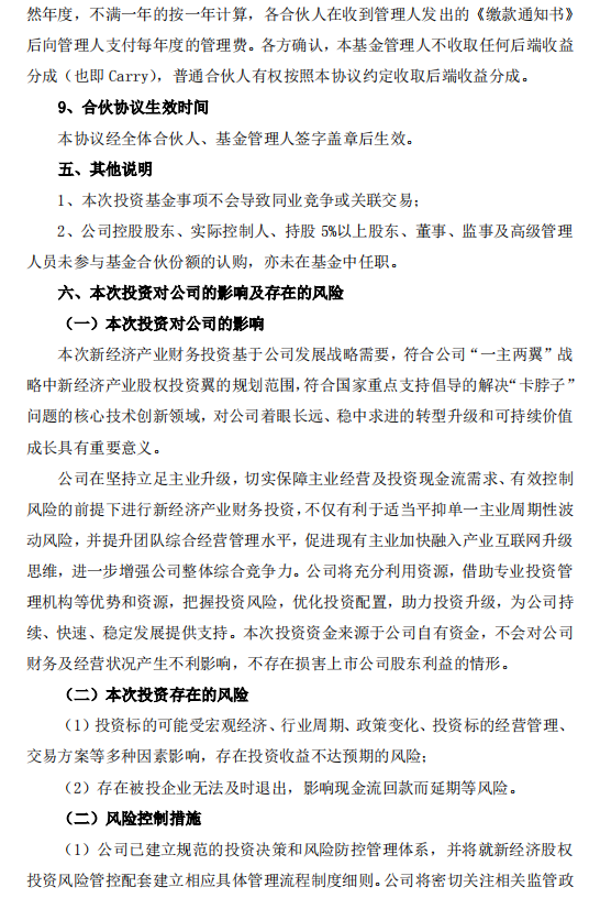 公司称,本次新经济产业财务投资基于公司发展战略需要,符合公司“一主两翼”战略中新经济产业股权投资翼的规划范围,对公司着眼长远、稳中求进的转型升级和可持续价值成长具有重要意义。