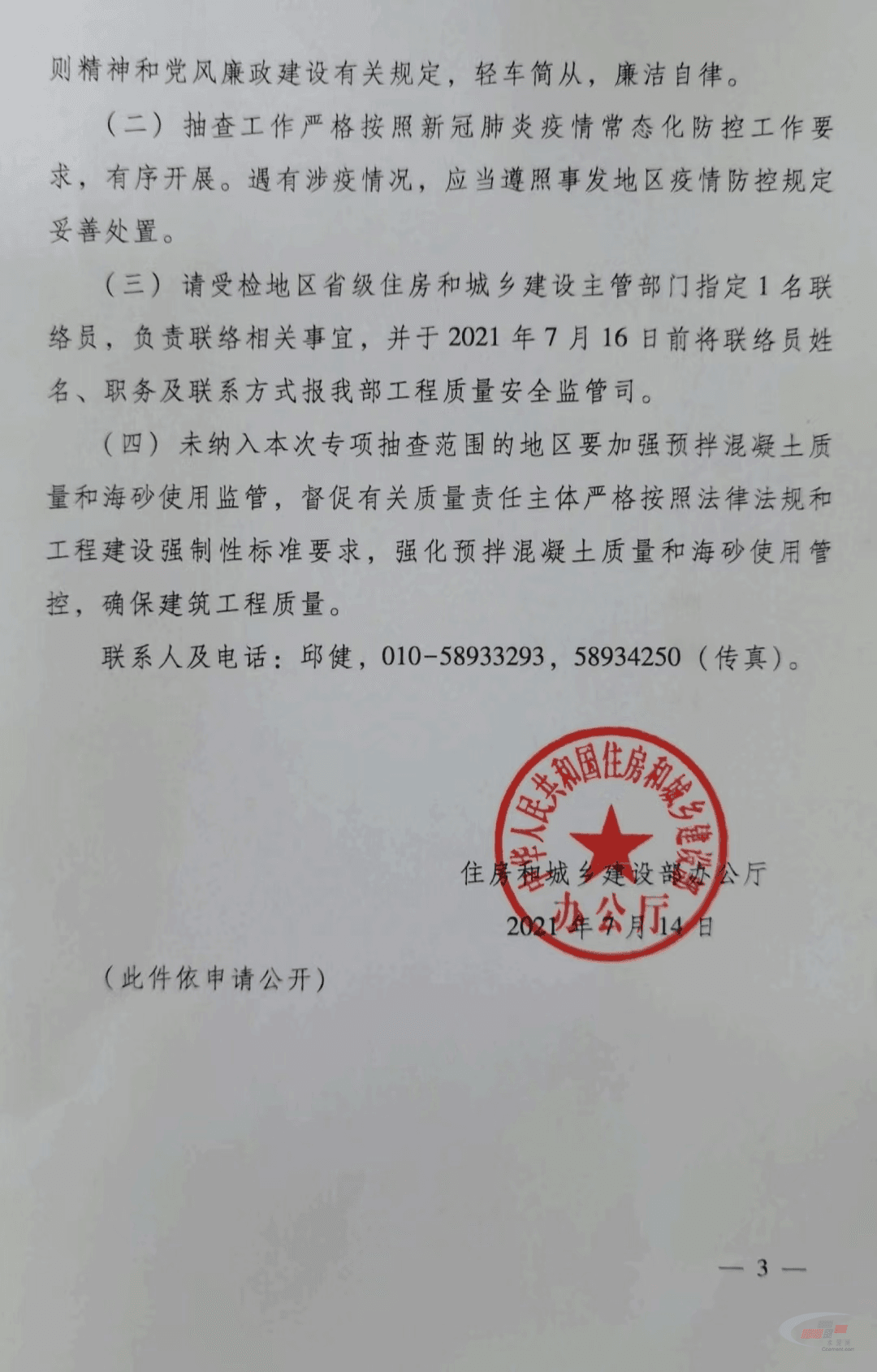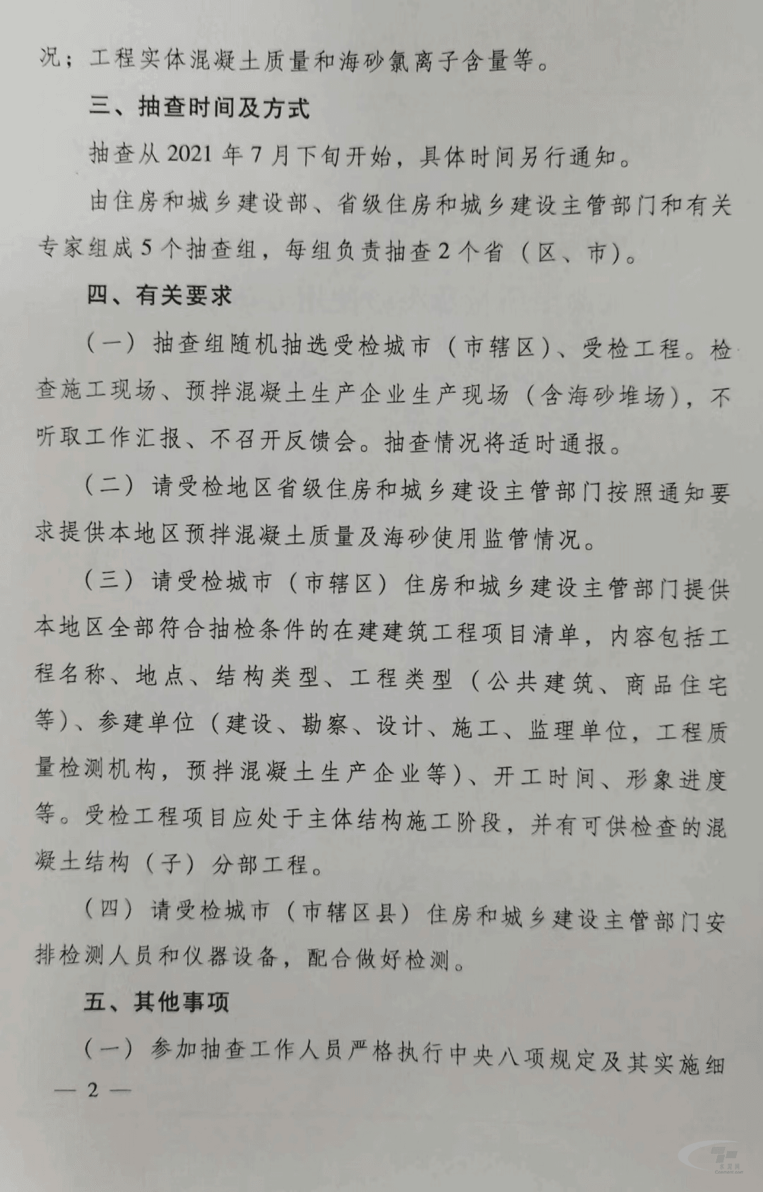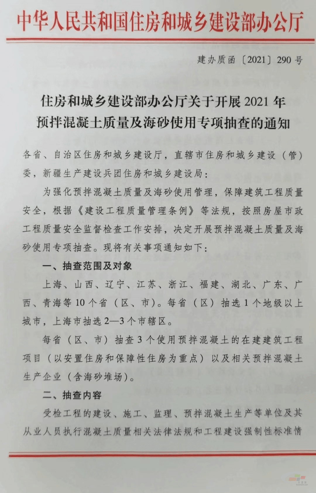 近日,住建部发布关于开展2021预拌混凝土质量及海砂使用专项检查通知。