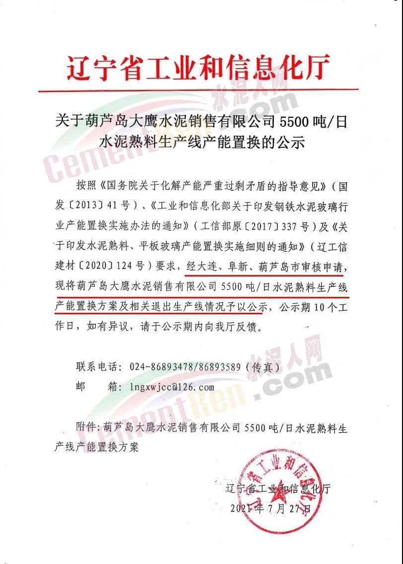 日前,辽宁省工信厅发布《关于葫芦岛大鹰水泥销售有限公司5500t/d水泥熟料生产线产能置换的公示》称,按照相关文件要求,经大连、阜新、葫芦岛市审核申请,现将葫芦岛大鹰水泥销售有限公司5500吨/日水泥熟料生产线产能置换方案及相关退出生产线情况予以公示,公示期10个工作日。