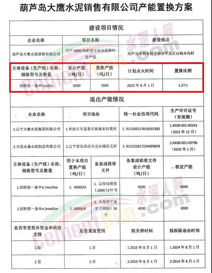 葫芦岛大鹰水泥销售有限公司产能置换方案显示,葫芦岛大鹰水泥销售有限公司拟通过减量置换在葫芦岛市杨家杖子经济开发区白杨木沟村新建一条5500t/d新型干法水泥熟料生产线。新建生产线关键设备回转窑规格为5.0m*82m,计划于2023年8月1日点火。