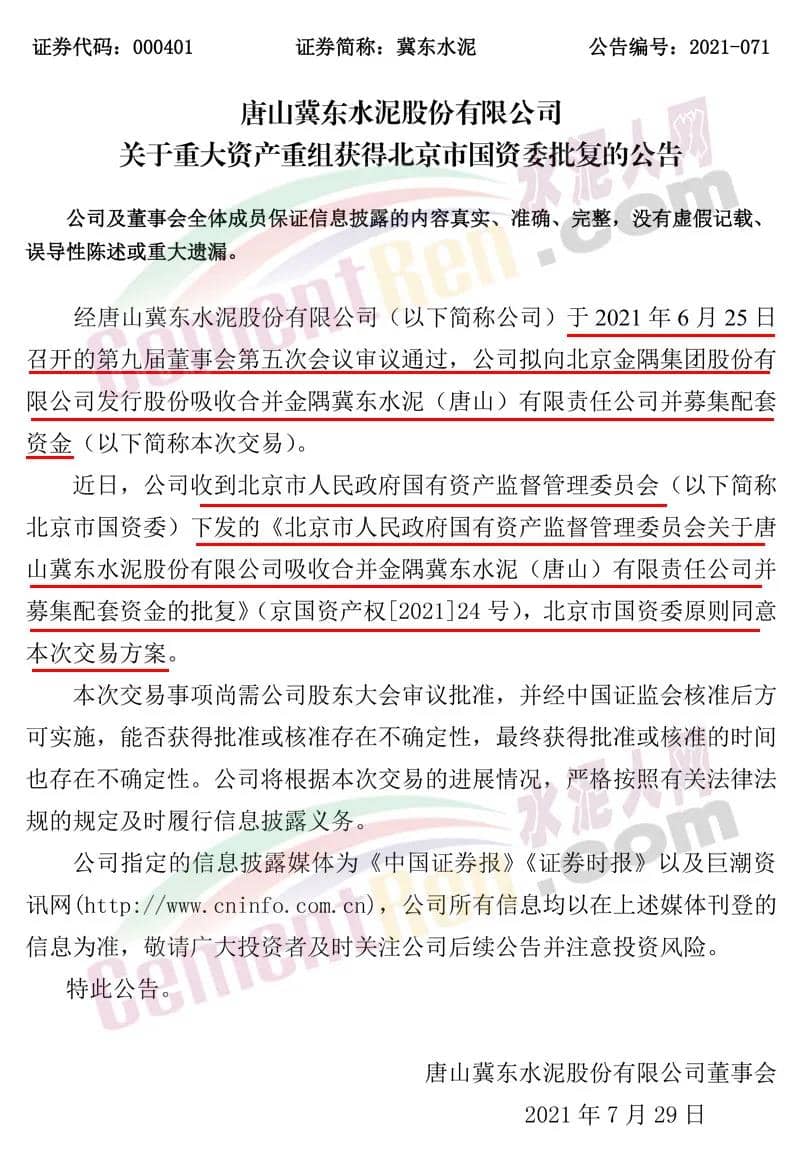 近日,公司收到北京市人民政府国有资产监督管理委员会下发的《北京市人民政府国有资产监督管理委员会关于唐山冀东水泥股份有限公司吸收合并金隅冀东水泥(唐山)有限责任公司并募集配套资金的批复》(京国资产权[2021]24号),北京市国资委原则同意本次交易方案。
