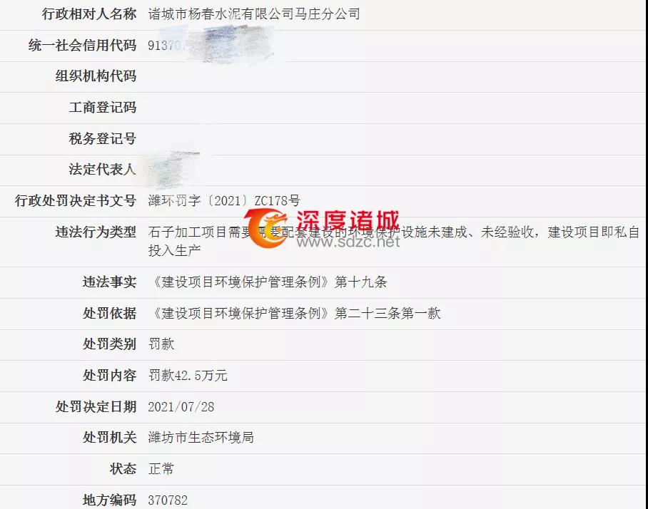 诸城市杨春水泥有限公司马庄分公司被罚48.75万元
