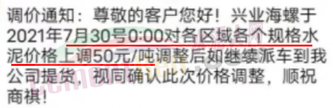 兴业海螺通知自7月30日0时起对各区域各个规格水泥价格上调50元/吨,调整后如继续派车到公司提货,视同确认此次价格调整。