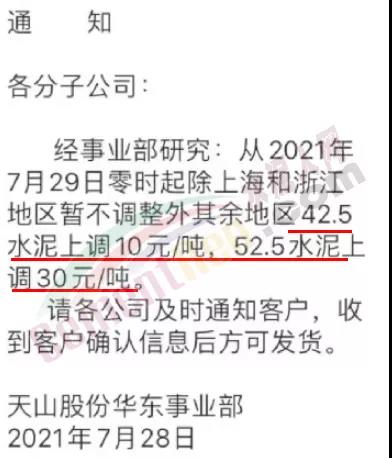 天山水泥股份公司发通知给各分子公司要求从7月29日零时起除上海和浙江地区暂不调整外其余地区42.5水泥上调10元/吨,52.5水泥上调30元/吨。
