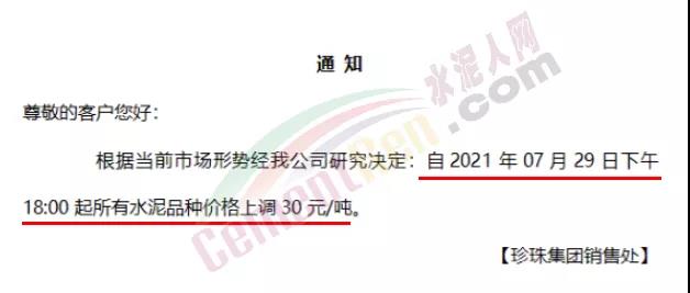 珍珠集团销售处通知自7月29日下午18:00起所有水泥品种价格上调30元/吨。