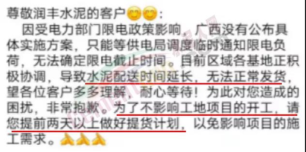 日前,华润水泥通知,因受电力部门限电政策影响,广西没有公布具体实施方案,只能等供电局调度临时通知限电负荷,无法确定限电截止时间。目前区域各基地正积极协调,导致水泥配送时间延长,无法正常发货,望各位客户多多理解,耐心等待。为了不影响工地项目的开工,请您提前两天以上做好提货计划,以免影响项目的施工需求。