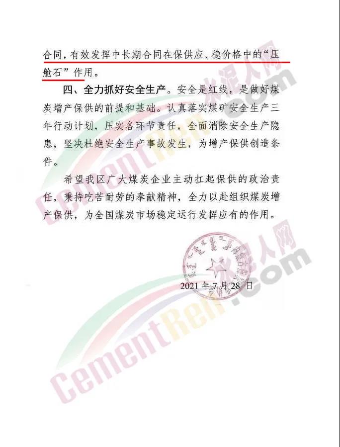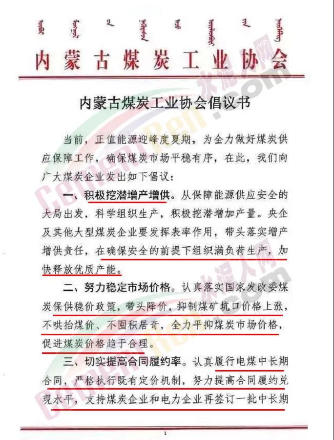 7月28日内蒙古煤炭工业协会发布倡议书称,当前,正值能源迎峰度夏期,为全力做好煤炭供应保障工作,确保煤炭市场平稳有序,向广大煤炭企业发出倡议,积极挖潜增产增供努力稳定市场价格。带头降价,抑制煤矿坑口价格上涨,不哄抬煤价、不囤积居奇,全力平抑煤炭市场价格。促进煤炭价格趋于合理。切实提高合同履约率。认真履行电煤中长期合同。严格执行既有定价机制。努力提高合同履约兑现水平,支持煤炭企业和电力企业再签订一批中长期合同,有效发挥中长期合同在保供应、稳价格中的“压舱石”作用。