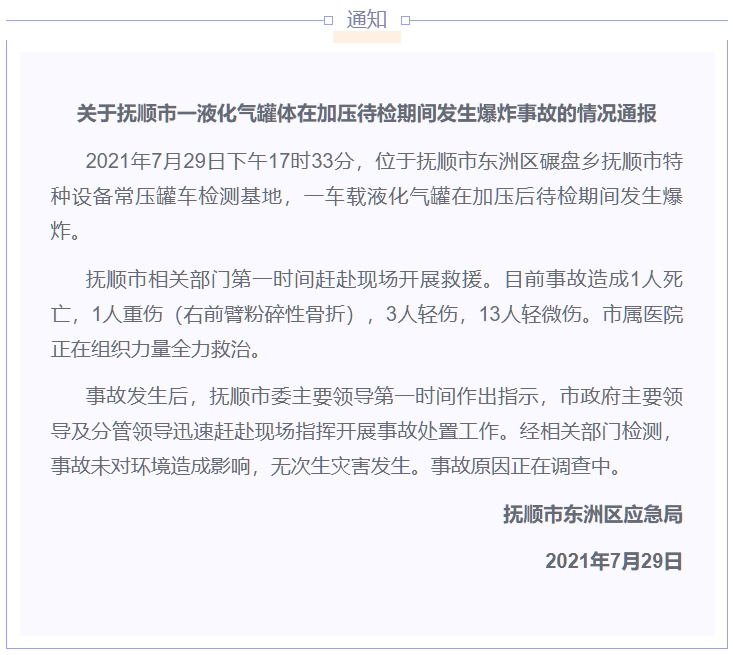 7月29日辽宁省抚顺市东洲区应急局发布《关于抚顺市一液化气罐体在加压待检期间发生爆炸事故的情况通报》称,2021年7月29日下午17时33分,位于抚顺市东洲区碾盘乡抚顺市特种设备常压罐车检测基地,一车载液化气罐在加压后待检期间发生爆炸。