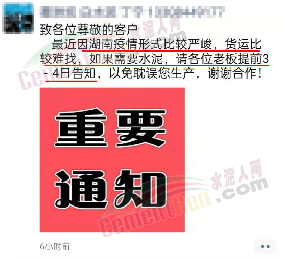 日前,葛洲坝石门特种水泥有限公司通知,最近因湖南疫情形势比较严峻,货运比较难找,如果需要水泥,请提前3-4日告知,以免耽误生产。