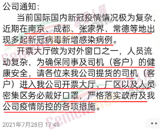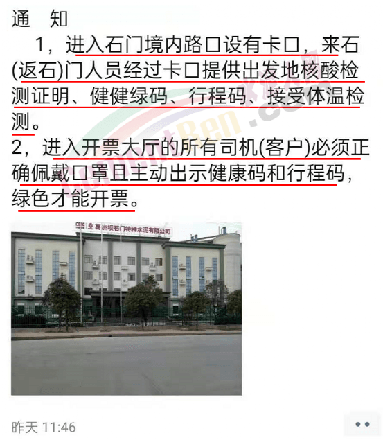 据水泥人网了解,企业近两日连续发布提示通知,提示车辆进入石门境内路口设有卡口,来往人员经过卡口需提供出发地核酸检验证明、健康绿码、行程码并接受体温检测。同时进入开票大厅的所有司机(客户)必须正确佩戴口罩,主动出示健康码,行程码,绿色才能开票。