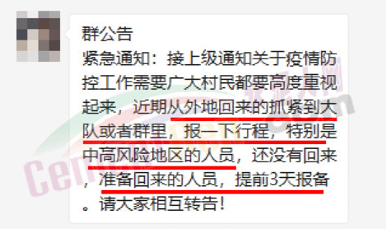 据上述销售人员反馈,村里发了紧急通知称,接到上级通知,要求从外地回村的人员抓紧报备行程,特别是从中高风险地区返回的人员。还没有回来的,准备回来的人员,提前3天报备。
