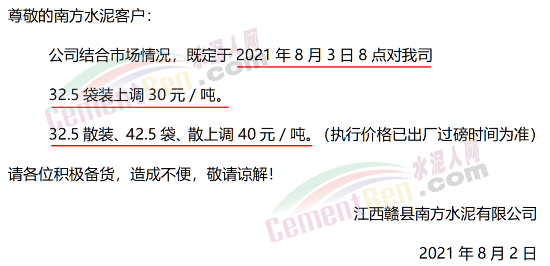 江西赣县南方水泥有限公司通知,今日(8月3日)上午8时起32.5袋装上调30元/吨,32.5袋装上调30元/吨。