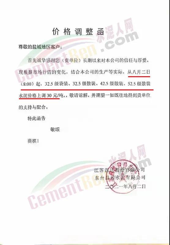 江苏磊达水泥通知盐城地区客户,从8月2日8时起,32.5级、42.5级水泥价格上调30元/吨。